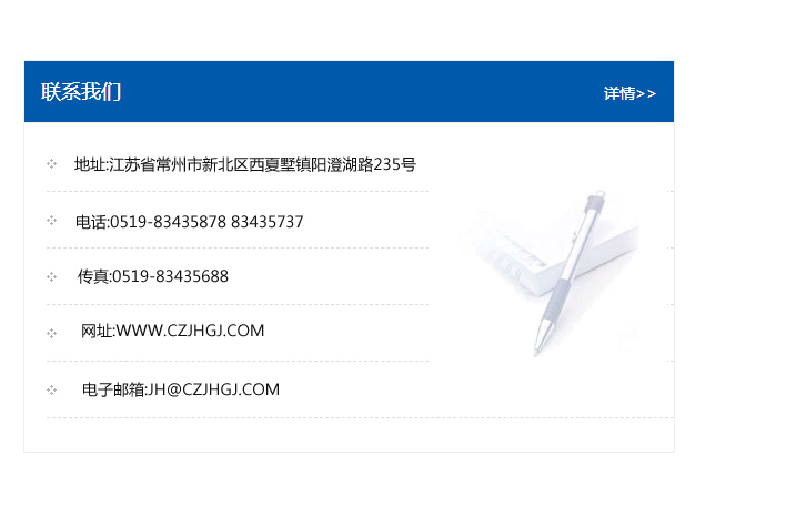 地址:常州市新北區友邦商務大廈1幢16、17層  電話:0519-85101652  傳真:0519-85112595  郵編:213022  網址:www.cz-jiayue_cn.gzbique.com  郵箱:xiajifengaa@163.com